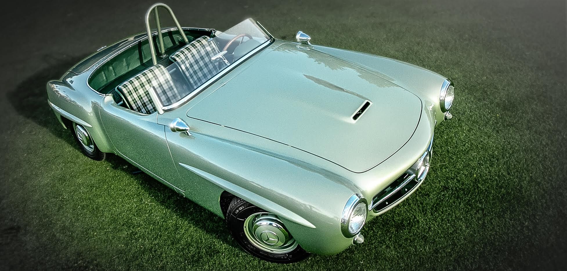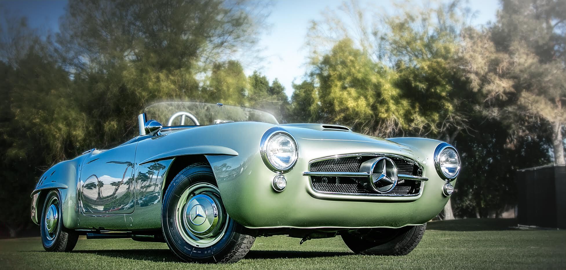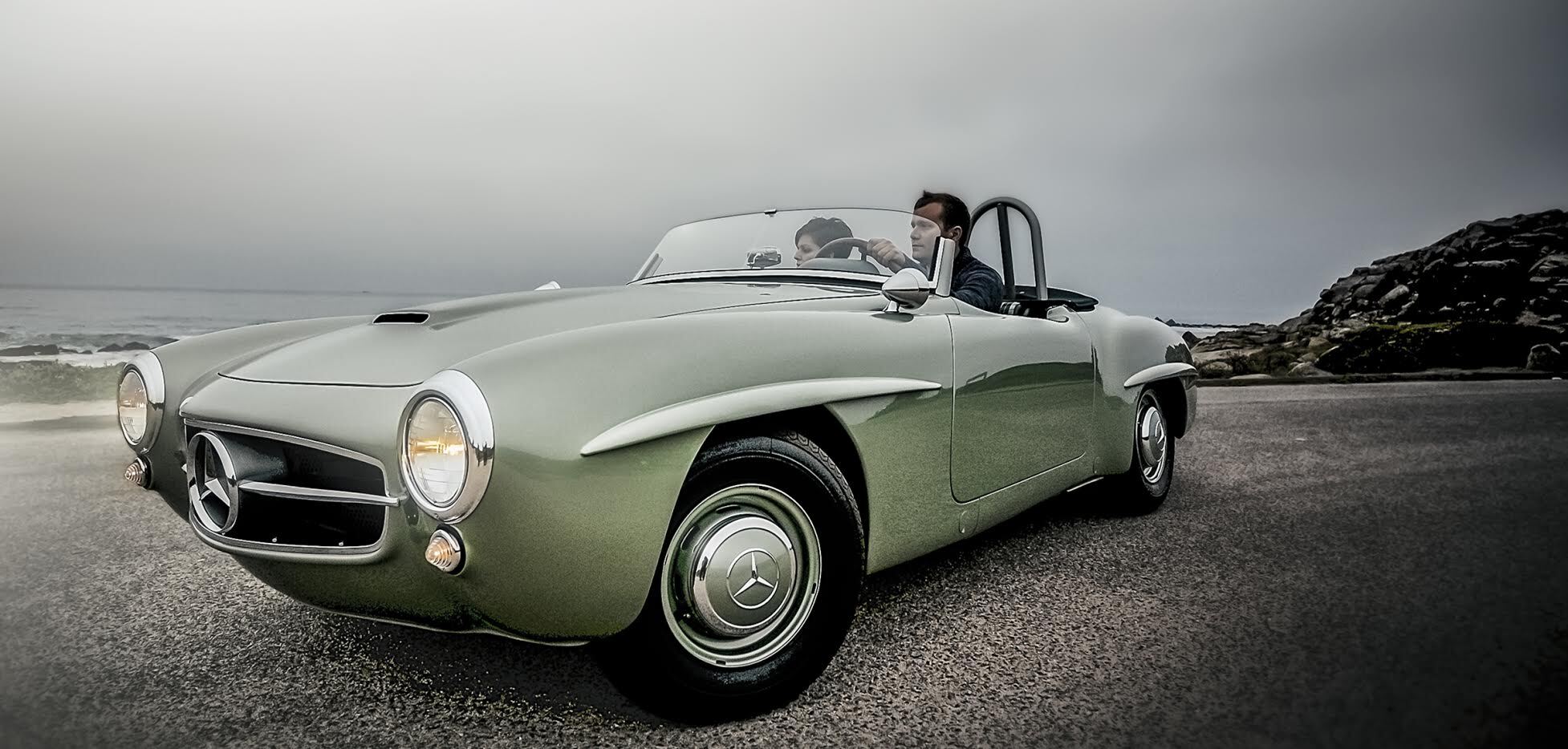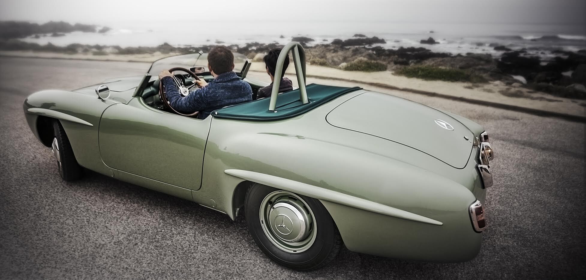 The second Mercedes Benz 190SLR, which is also a 1955 was turned into this race spec by Mercedes Benz Classic Center. Before the intense restoration the vehicle was owned by actor Patrick Dempsey. When Mercedes Benz Classic decided to do this restoration, they took a 190SL and turned it into an SLR which is race spec. The light green exterior, has a green tartan checkered interior. As there are only a handful of this model due to it being a tribute to racing prepared vehicles.