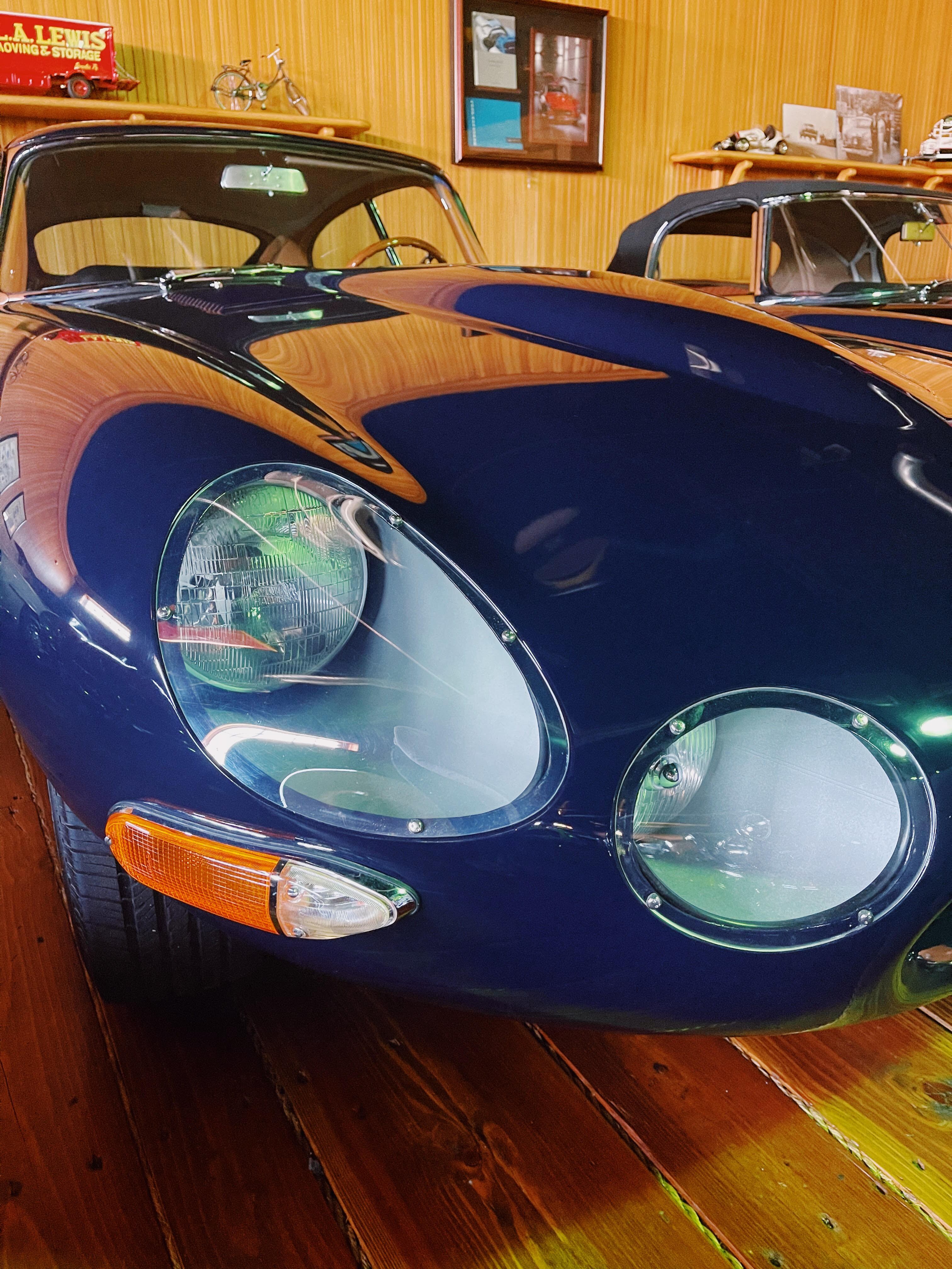 The “plum” blue 1964 Jaguar E-Type, Race, Coup is a beautiful special car in our collection. The vehicle which was purchased and restored from Classic Showcase, in Oceanside, California. This model was from an E-Type body, but it had been changed into a race car body. Malcolm Sayer who designed the base E-Type, was first showcased at the 1961 Geneva Show. Though there is unclear number of Race E-Types produced, since it is a rare race spec vehicle, 18,808 base E-Types were made.